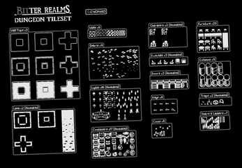 Bitter Realms Dungeon Tileset is a 1-bit, 16x16 tileset that includes a wide variety of structural and decorative tiles for building interesting and visually appealing dungeons and castle interiors.